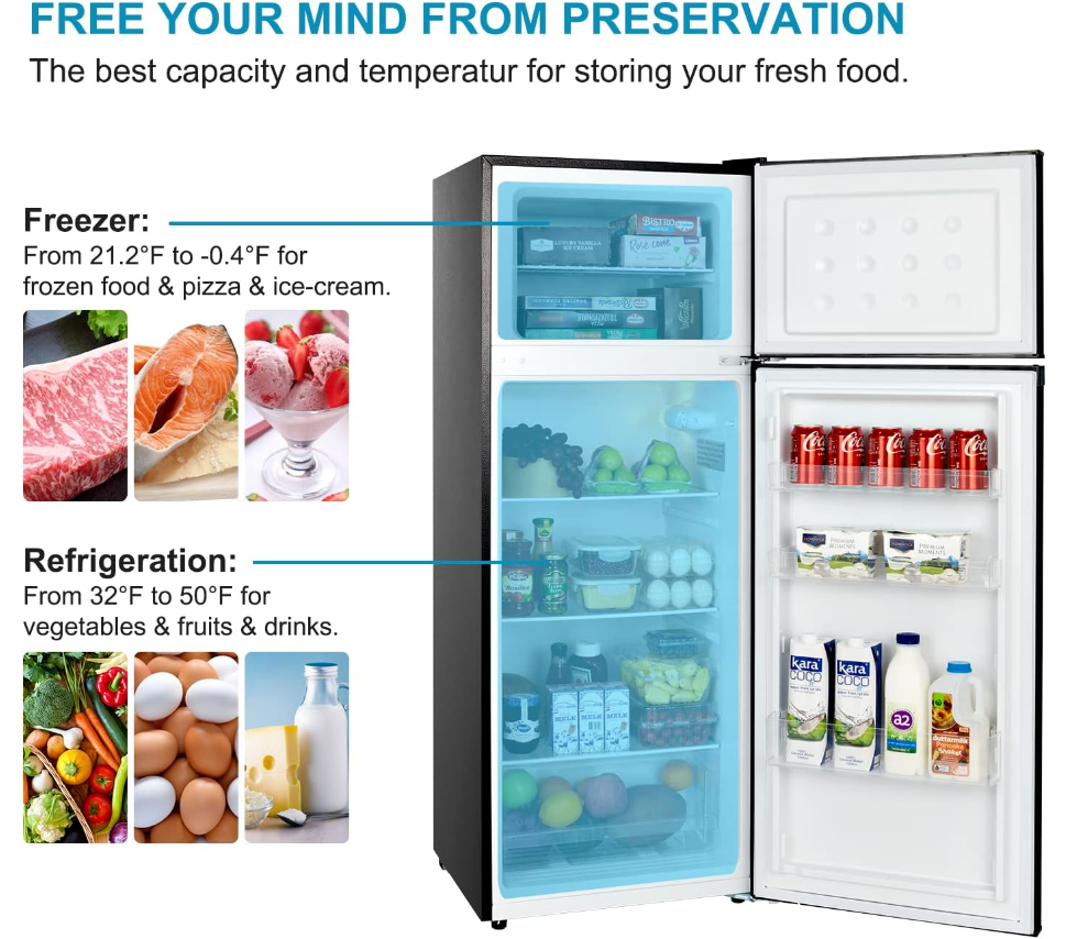 • 7 Adjustable Temperature Control: From 21.2°F to -0.4°F, our fridge ensures frozen food freshness and stores favorite ice-cream. Performed from 32°F to 50°F in refrigerator zone, the refrigerator keeps ingredients fresh and locking moisture.