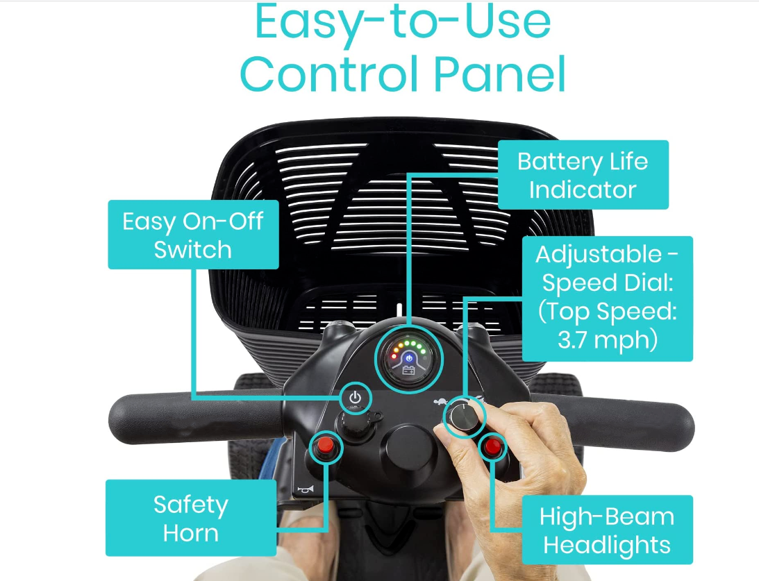 【Safety First 】 The mobility scooter is equipped with four pneumatic tires and anti-roll wheels to give you more comfortable and smooth driving experience,even when the vehicle drives on moderately rough roads.And the scooter is designed with the intuitive control panel which is easy to operate. It is designed with electromagnetic brake which is easy to control and much safer. The scooter comes with headlights and brake lights to ensure safe driving.