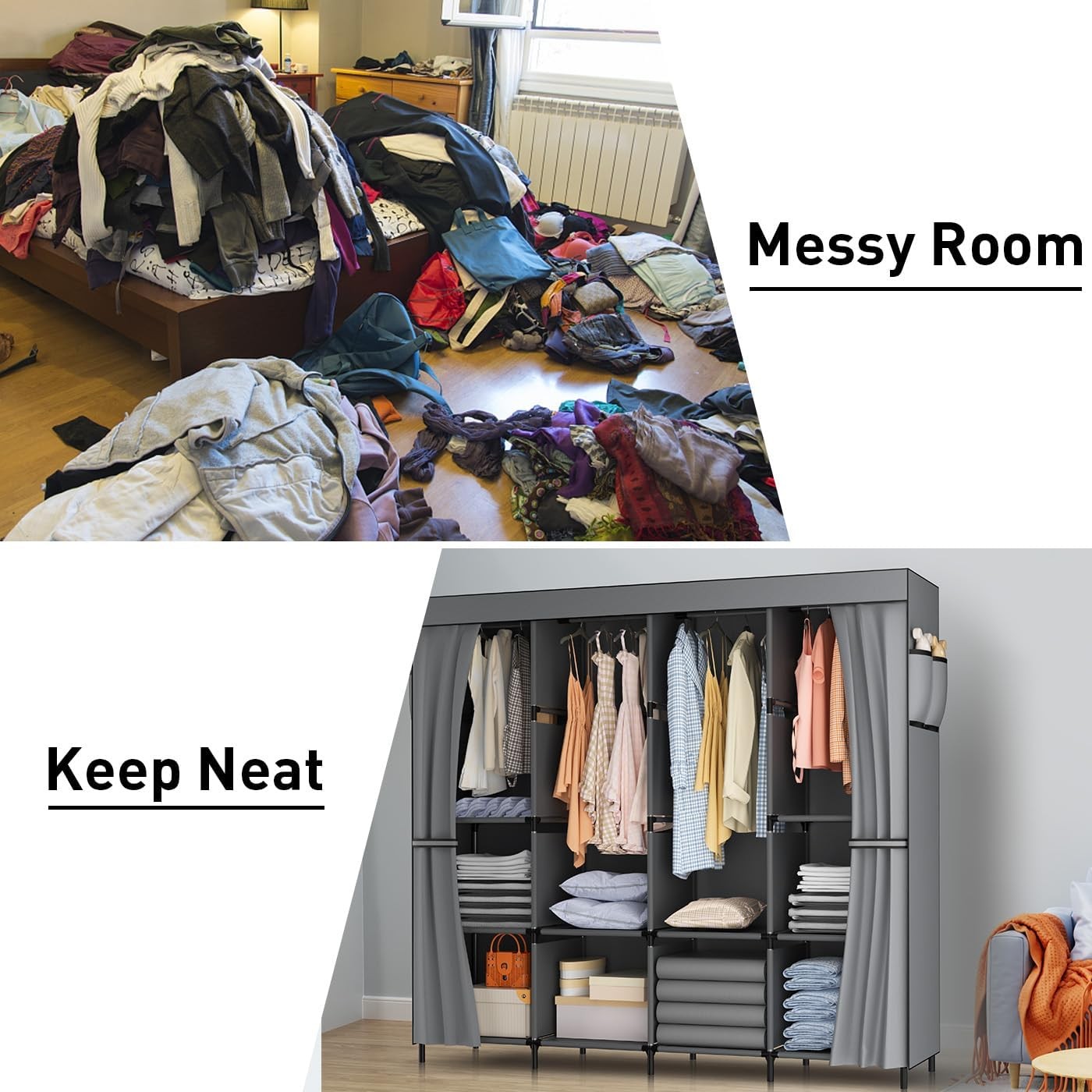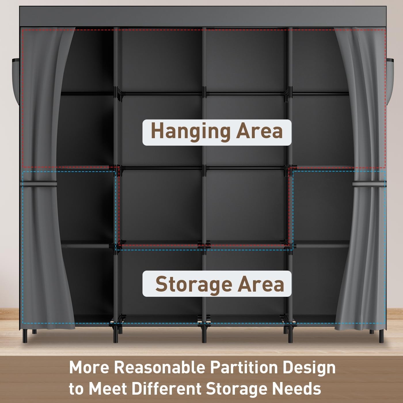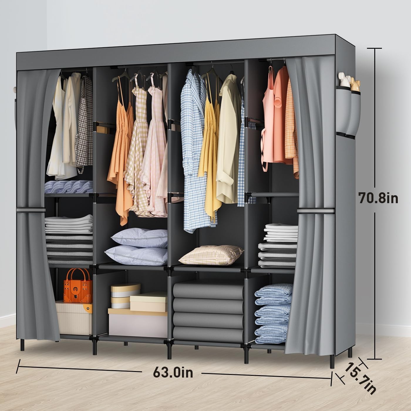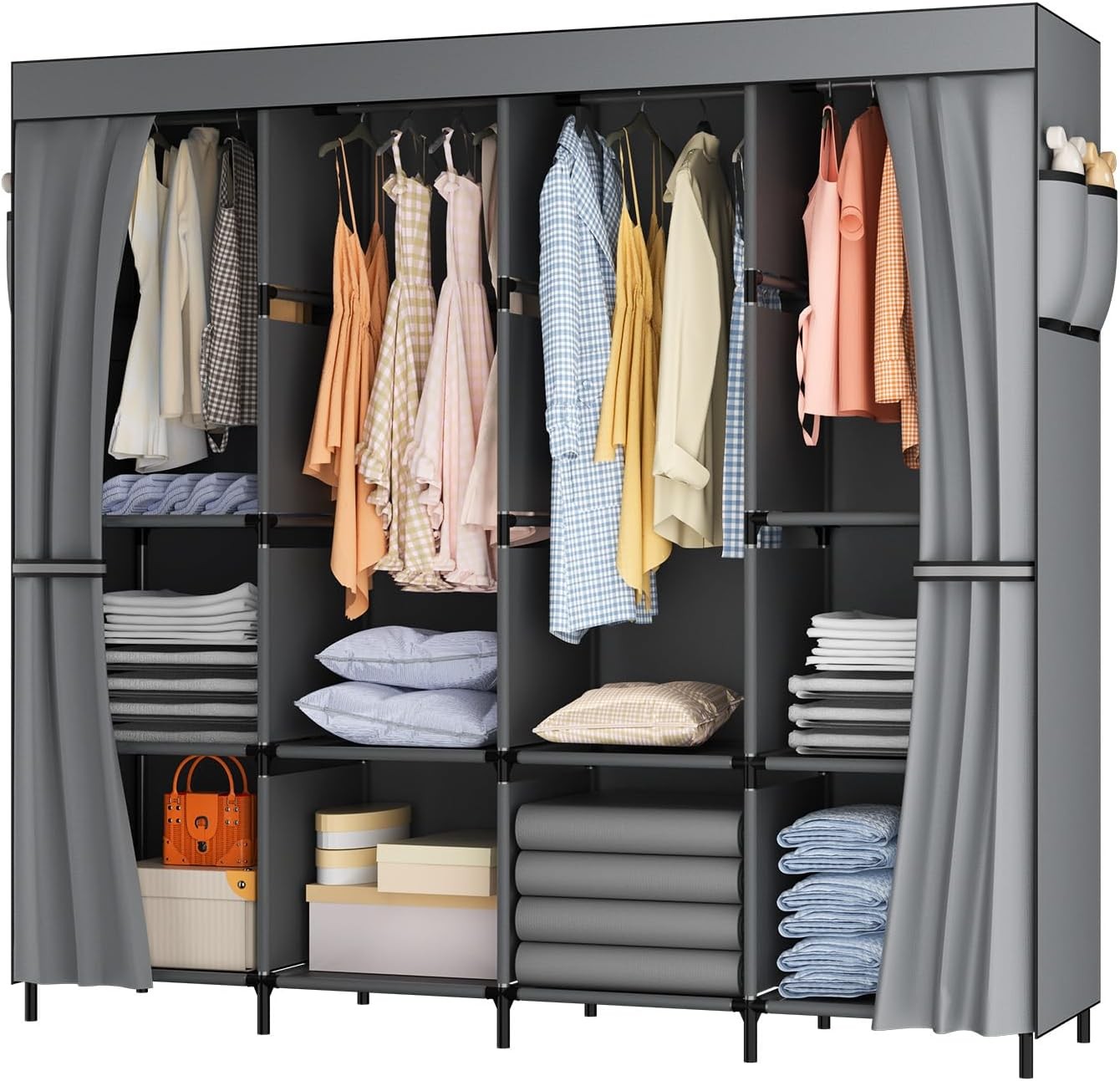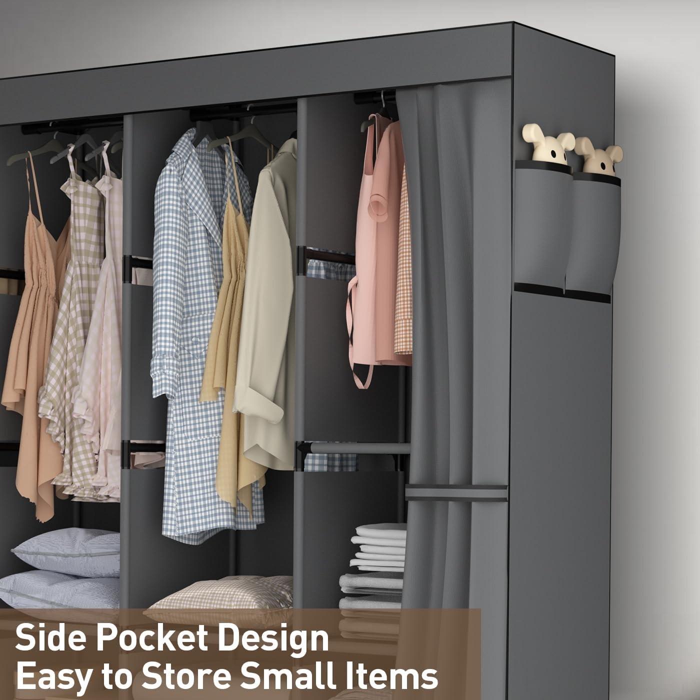 LOEFME Portable Closet Wardrobes for Hanging Clothes with 4 Hanging Rods and 6 Storage Organizer Shelves,Sturdy Storage Wardrobe for Bedroom Free Standing Cloth Rack with Cover, Gray