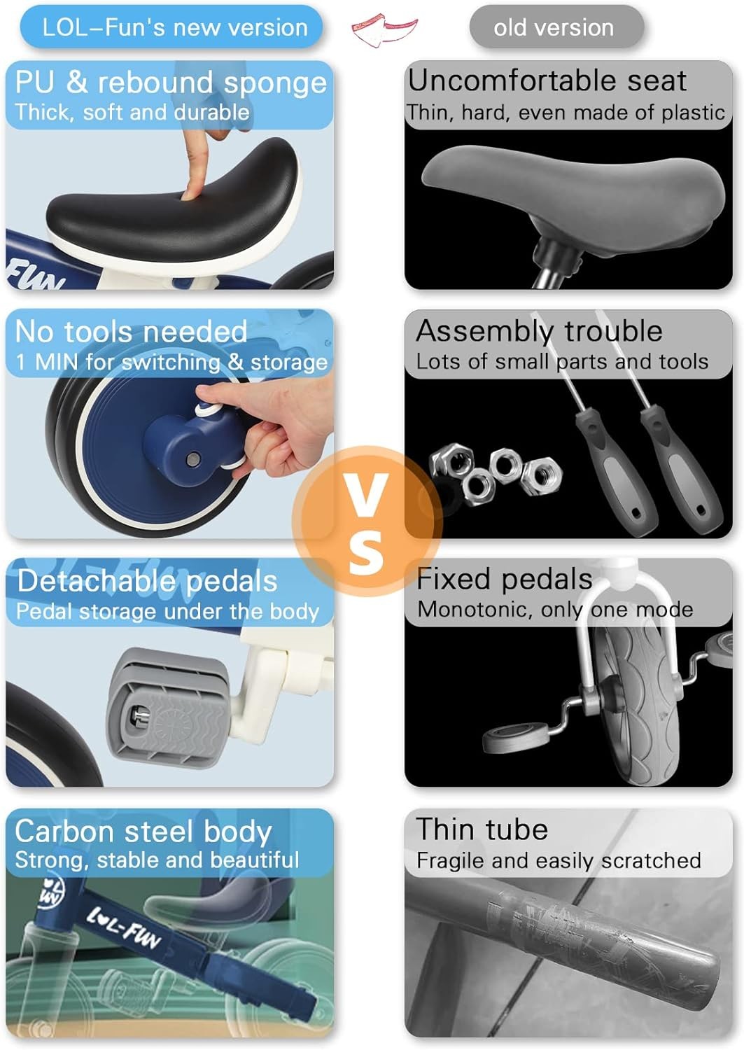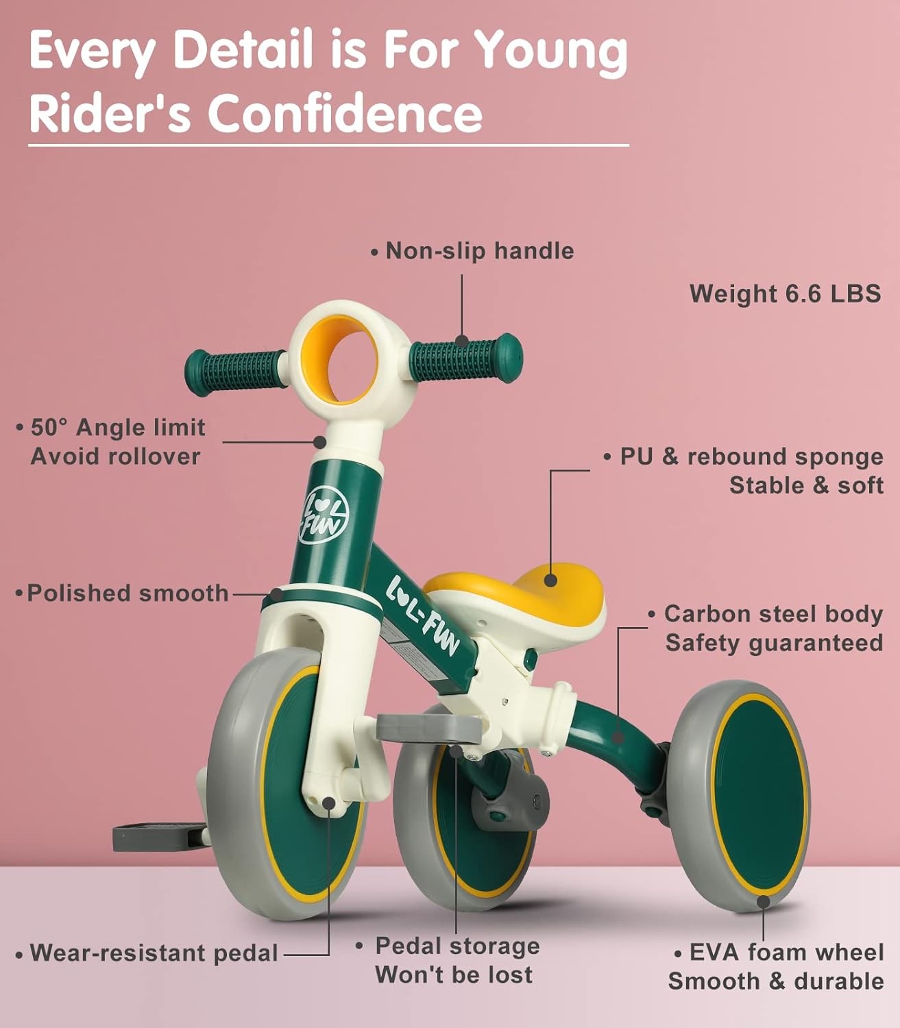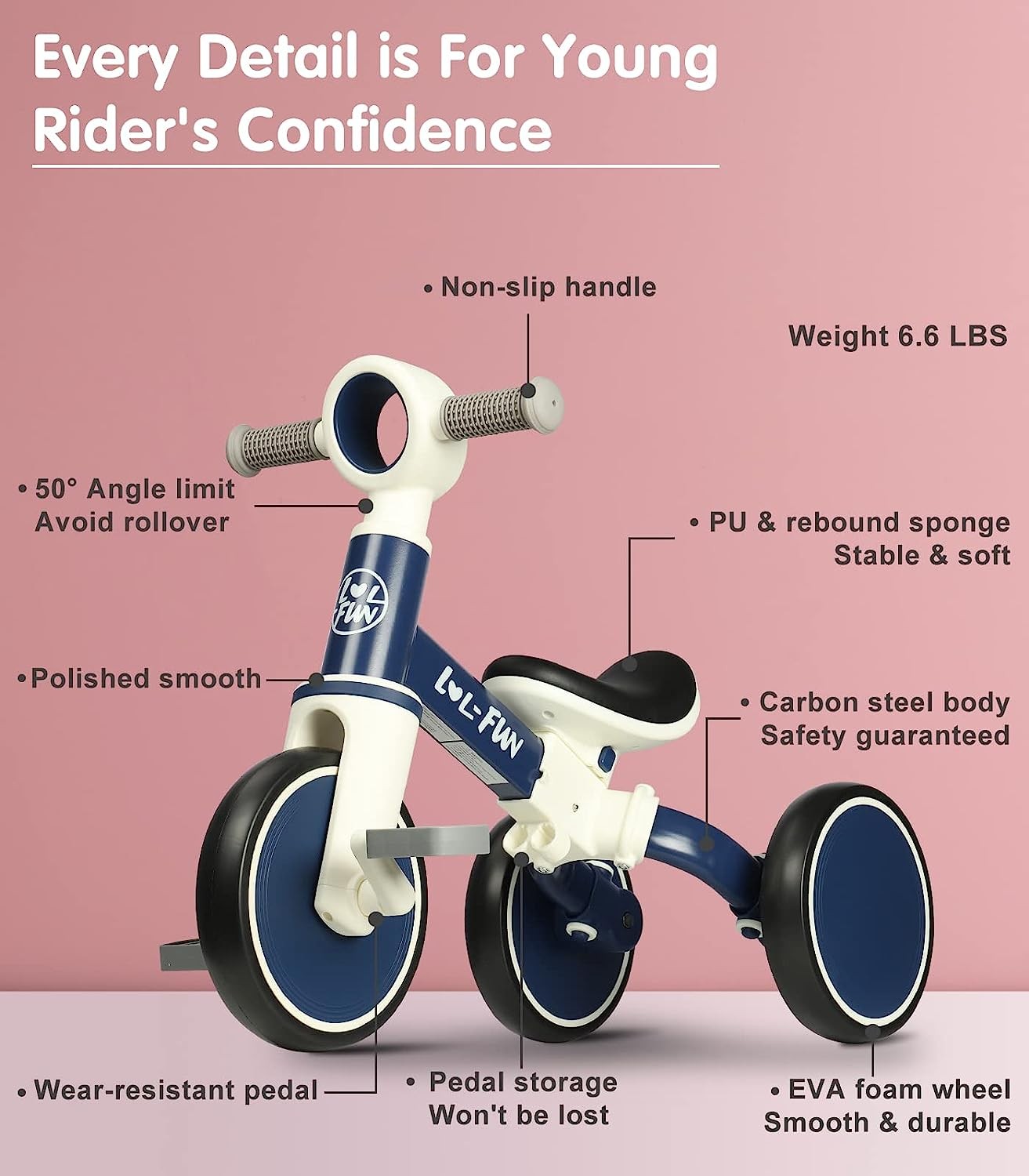 LOL-FUN 4 in 1 Toddler Balance Bike for 1-4 Years Old Boys Girls Gift, 3 Wheel Baby Bicycle for 1 Year Old Kids Tricycle with Easy Assembly Removable Pedal
