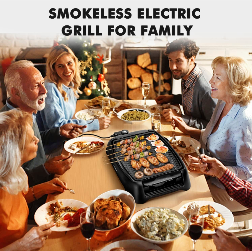 • : Smokeless electric grill indoor is big enough for the whole family party. Enjoy making grilled steak, chicken skewers, bacon, fish, kabobs, pork chops, burgers, chicken, salmon, vegetables and more! Optimal choice for BBQ, family meals, Parties, Holiday, Halloween, Thanksgiving Day, Christmas, Valentine's Day. The grill electric not only can be used at home, but also is perfect for picnics, RV, camping etc.