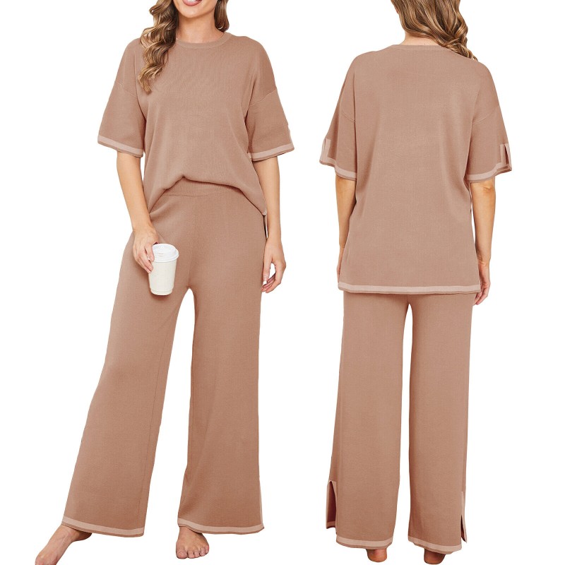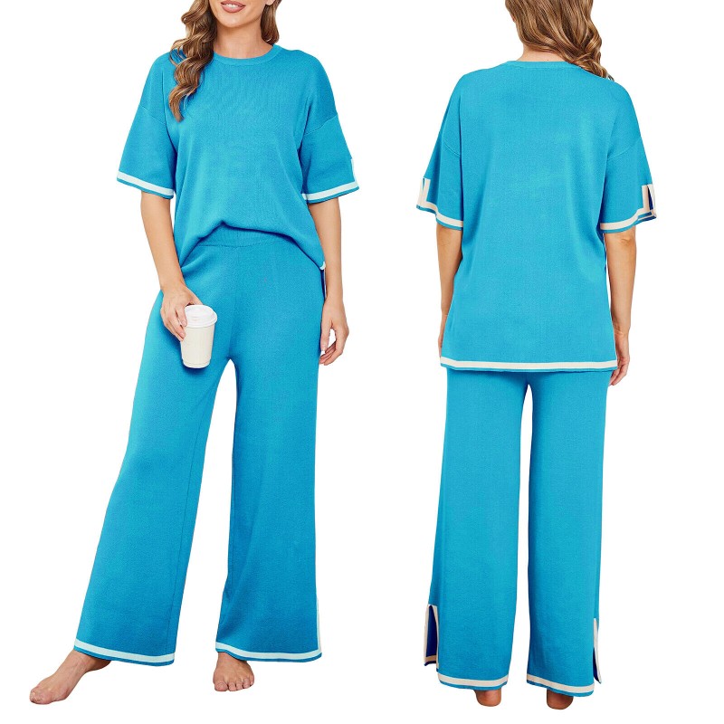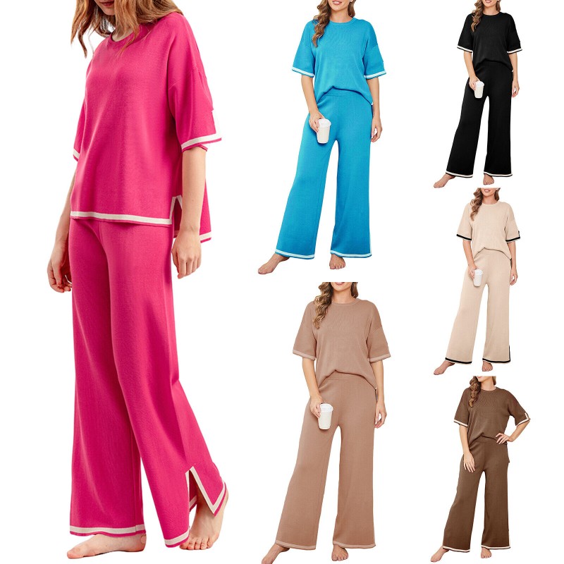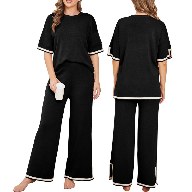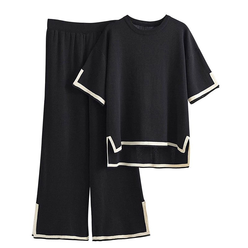 Women Casual Outfit Short Sleeve Crew Neck Tops Wide Leg Pants Loungewear Set